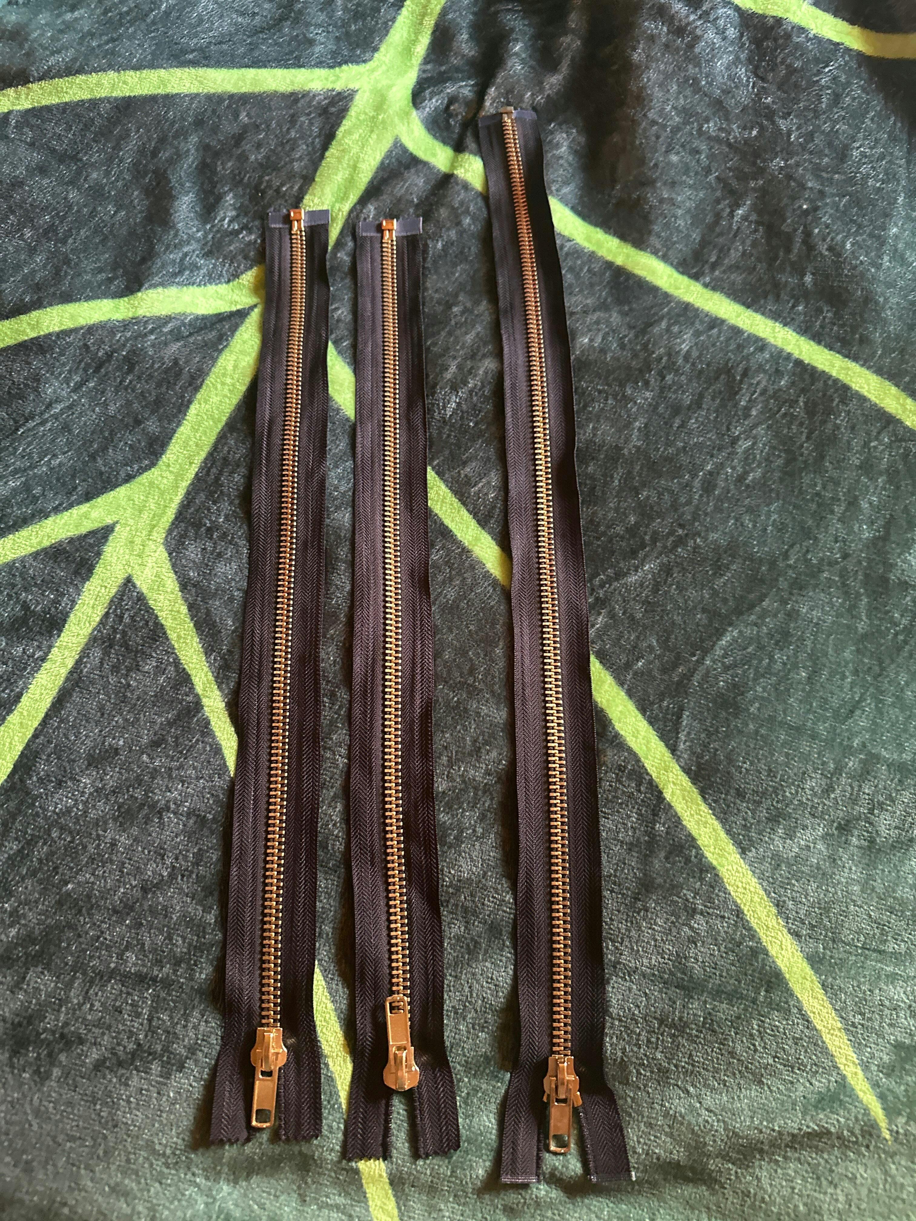 #10 brass heavy-duty separating zippers are made of heavy-gauge metal and feature teeth that measure approximately 10mm (1/2 inch) wide when zipped. These jumbo zippers separate at the bottom, jacket-style.